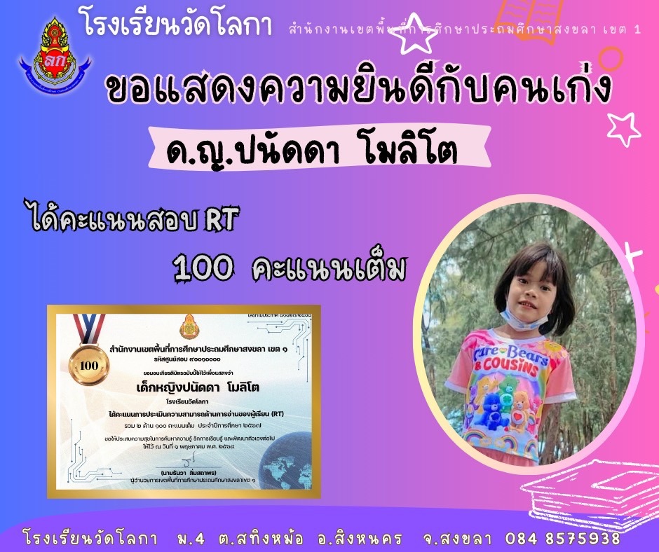ทางโรงเรียนวัดโลกา ขอแสดงความยินดีกับคนเก่ง เด็กหญิงปนัดดา โมลิโตได้คะแนนสอบRTประจำปีการศึกษา 2567 100 คะแนนเต็ม