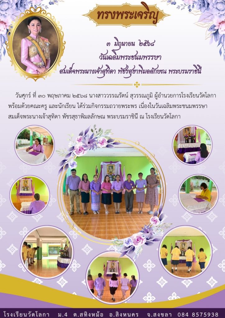 วันศุกร์ที่ 30 พฤษภาคม 2568 นางสาววรรณรัตน์ สุวรรณภูมิ พร้อมด้วยคณะครูโรงเรียนวัดโลกาและนักเรียน ได้ร่วมกิจกรรมถวายพระพร เนื่องในวันเฉลิมพระชนมพรรษาสมเด็จพระนางเจ้าสุทิดา พัชรสุธาพิมลลักษณ พระบรมราชินี ณ โรงเรียนวัดโลกา