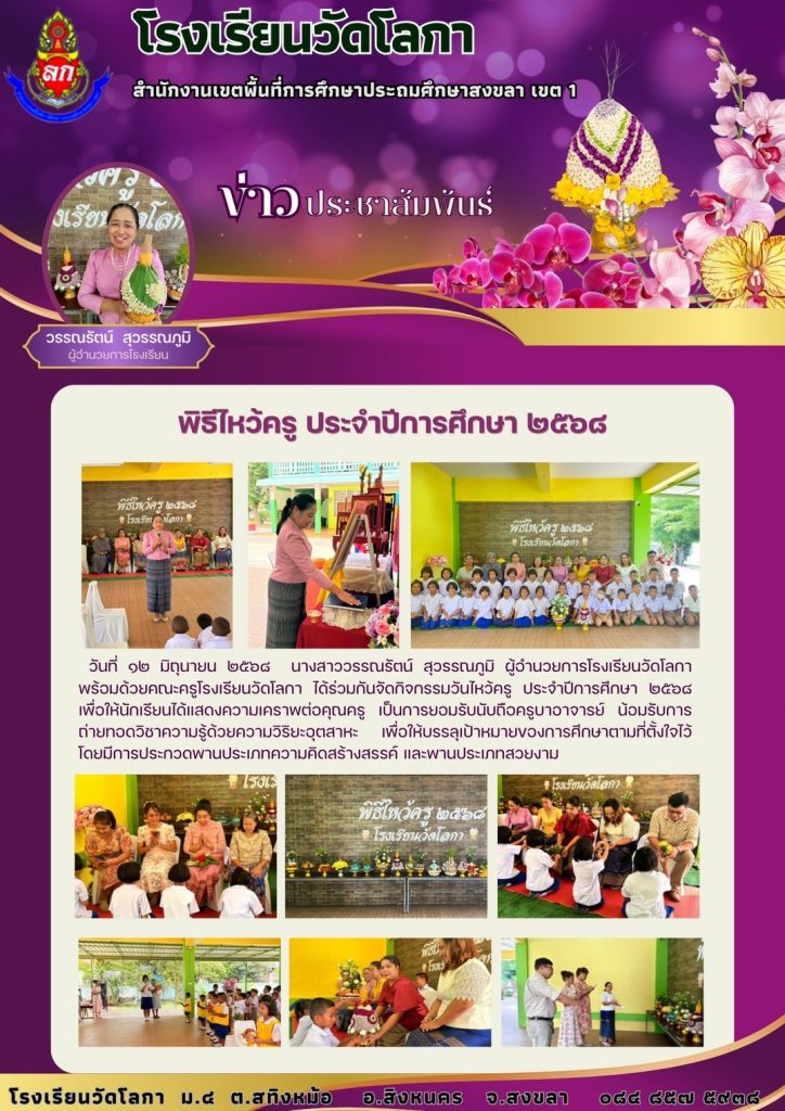 วันที่ 12 มิถุนายน 2568 นางสาววรรณรัตน์สุวรรณภูมิ ผู้อำนวยการโรงเรียนวัดโลกาพร้อมด้วยคณะครูโรงเรียนวัดโลกา ได้ร่วมกันจัดกิจกรรมไหว้ครู ประจำปีการศึกษา 2568 เพื่อให้นักเรียนแสดงความเคารพต่อครูผู้ถ่ายทอดวิชาความรุ้